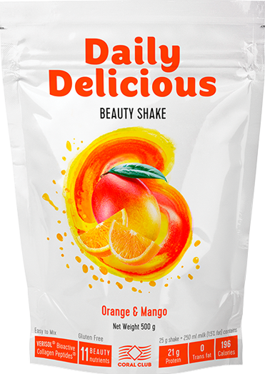 Cocktail-urile proteice Daily Delicious Beauty Shake (fără gluten) cu arome naturale de vanilie, zmeură, ciocolată, portocală și mango reprezintă o sursă echilibrată de proteine vegetale şi animale care în combinaţie cu colagenul şi un complex de vitamine şi minerale, contribuie activ și benefic la menţinerea vitalității organismului, susţine activitatea fizică și vă oferă energie în fiecare zi. Cocktail-urile includ 11 substanţe nutritive atent selecționate, acestea ajută la menţinerea elasticităţii şi fermităţii pielii, a sănătăţii părului şi rezistenţei unghiilor.